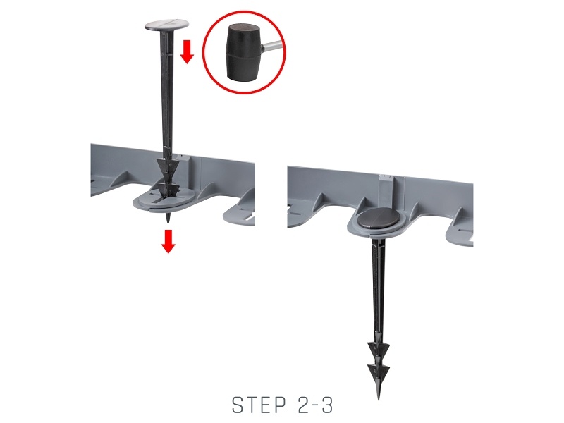 Figyelmeztetés: A műanyag rögzítő tüskék csak puhább talajhoz ajánlottak. Keményebb talajhoz előnyösebb pl. a Geopin Steel fém leszúró tüske vagy egyszerű fém cövekek (minden nagyobb barkácsüzletben kaphatóak) használata.