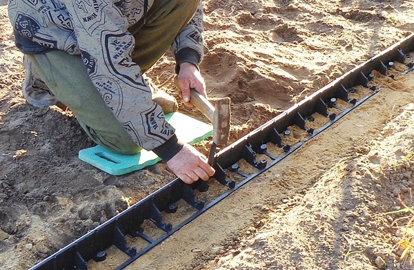 A műanyag ágyásszegély 25 cm-es hosszúságú leszúrótüskével rögzíthető (a csomagolás általában nem tartalmazza). A forma összetettségétől függően 2–3 tüskére lesz szükségünk 1 méternyi ágyásszegélyhez (szűk ívekhez akár 5–6 tüskére is).