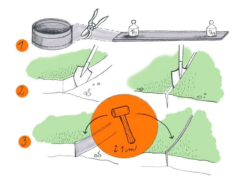2. Az ágyásszegély a kívánt hosszra vágható. Vágja le a kerti szegélyt kisebb méretű metszőollóval, nagyobb késsel vagy sarokcsiszolóval (flex), vékony koronggal.