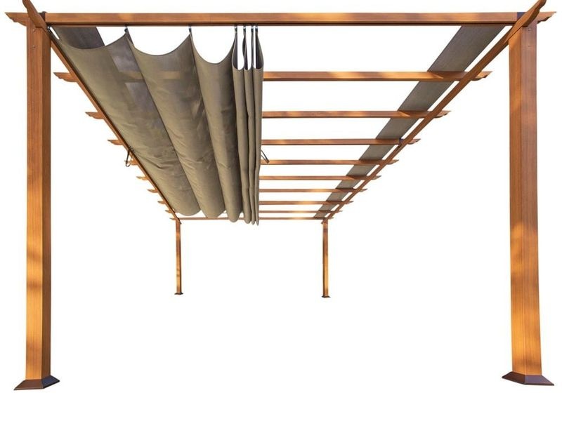 A fix tető helyett a pergola légies gerendás kialakítással rendelkezik. Az árnyékolást egy 0,8 mm vastag poliészter vászon biztosítja, amely akár 70%-os UV-védelmet nyújt, vízlepergető és könnyen tisztítható. Télen ajánlott a vásznat kiszárítani és száraz helyen tárolni.