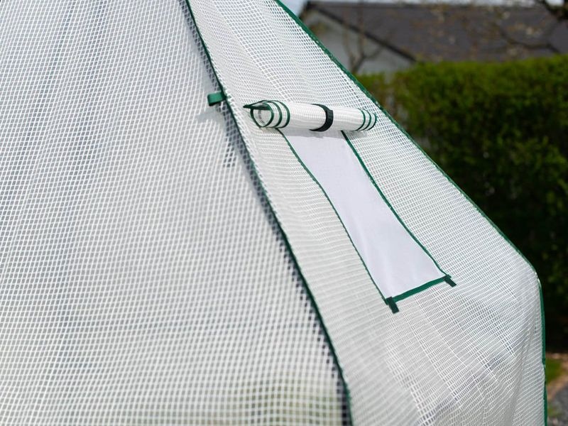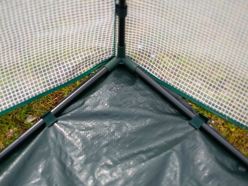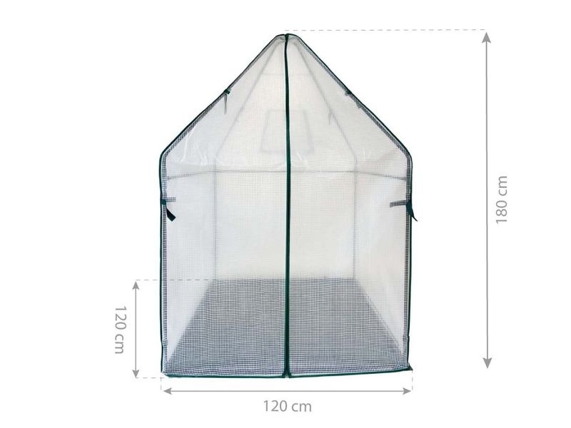 A masszív szerkezet acél vázból készült, amely garantálja a stabilitást. Tartós, UV-álló fóliával van bevonva, amely nyáron csökkenti a közvetlen napsugárzást, télen pedig véd a fagytól. A bejárat cipzáros ajtóval van ellátva, amely nyitott állapotban pántokkal rögzíthető. A szellőzőablak lehetővé teszi a levegő megfelelő áramlásának szabályozását a sátor belsejében.