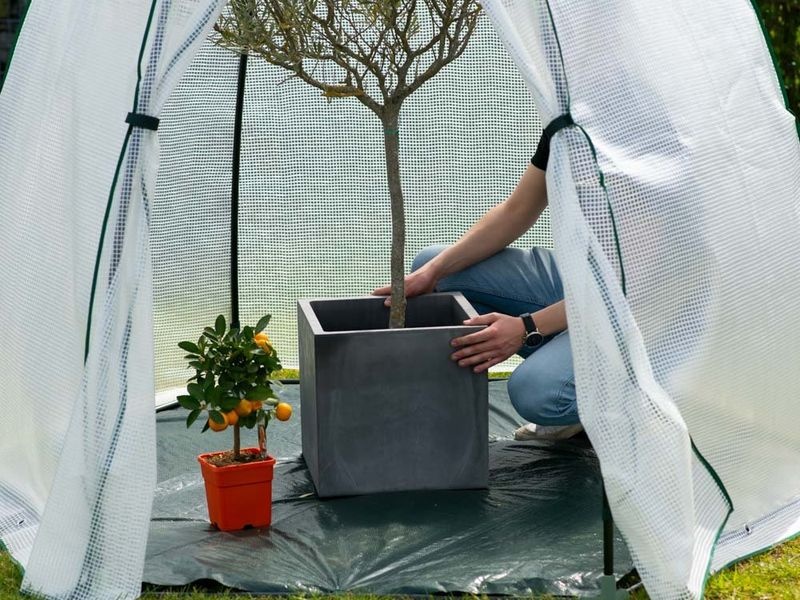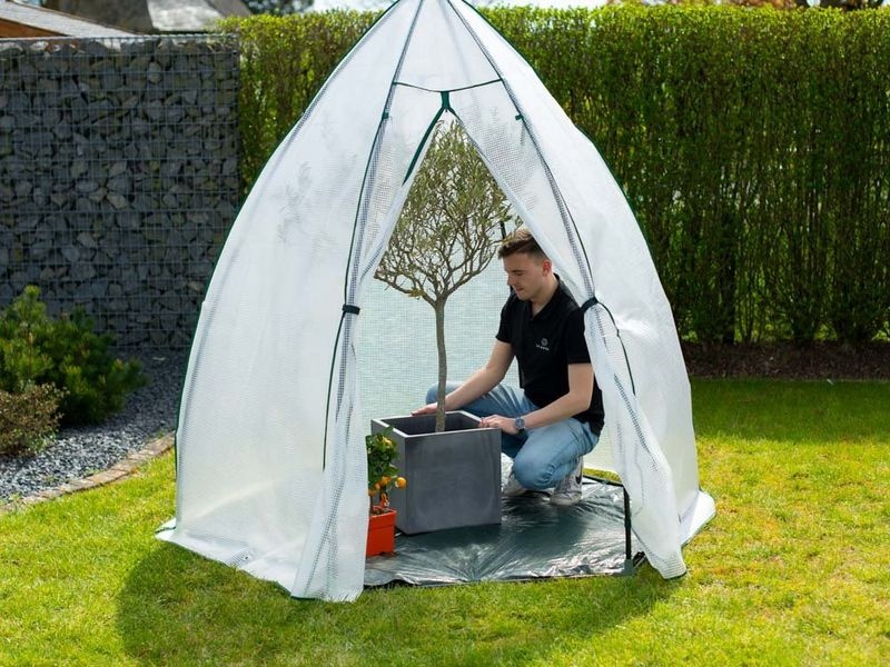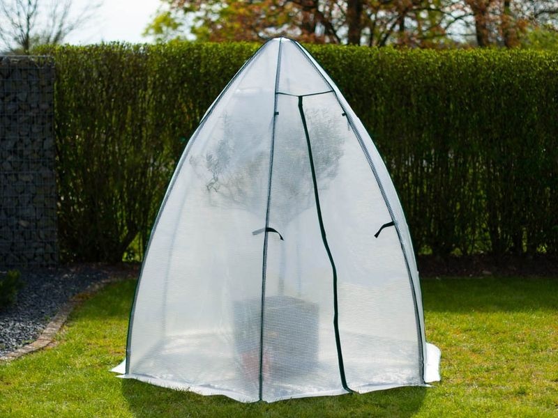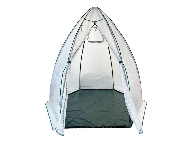 A stabil acél vázszerkezetet tartós, UV-álló fólia borítja, amely nyáron véd a közvetlen napsütéstől, télen pedig szigetel a fagy ellen. A praktikus cipzáros ajtó könnyű bejutást biztosít, míg a beépített szellőzőablak elősegíti a levegő megfelelő keringését a sátor belsejében.
