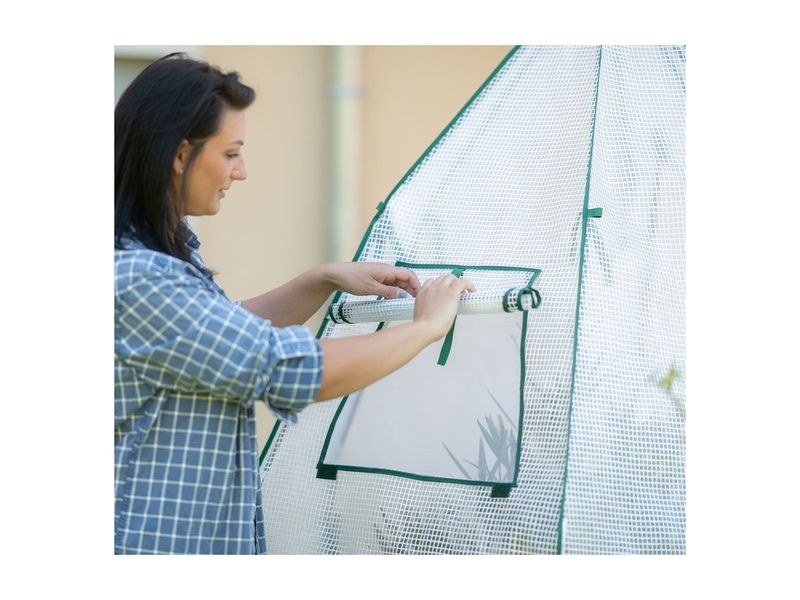 A stabil acél vázszerkezetet tartós, UV-álló fólia borítja, amely nyáron véd a közvetlen napsütéstől, télen pedig szigetel a fagy ellen. A praktikus cipzáros ajtó megkönnyíti a bejutást, míg a beépített szellőzőablak biztosítja a levegő keringését a belső térben.