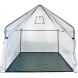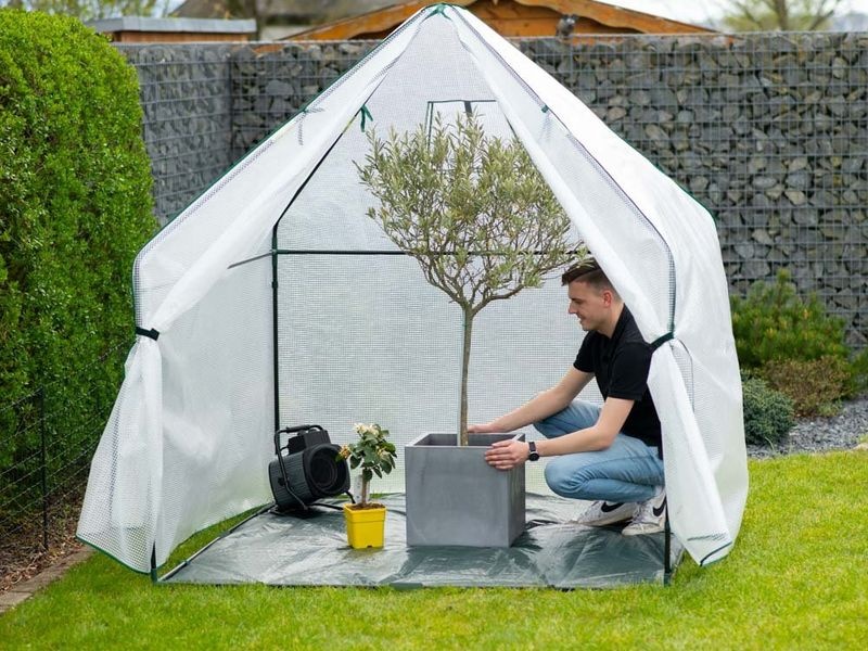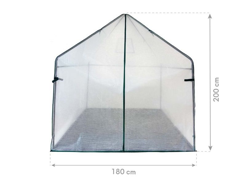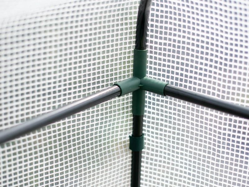 A stabil acél vázszerkezetet tartós, UV-álló fólia borítja, amely nyáron véd az erős napsütéstől, télen pedig szigetelő hatást biztosít a hideg ellen. A sátor szellőzőablakkal is rendelkezik, amely megkönnyíti a hőmérséklet és páratartalom szabályozását. A bejárat cipzáros ajtóval van ellátva, amely kényelmesen nyitható és rögzíthető.