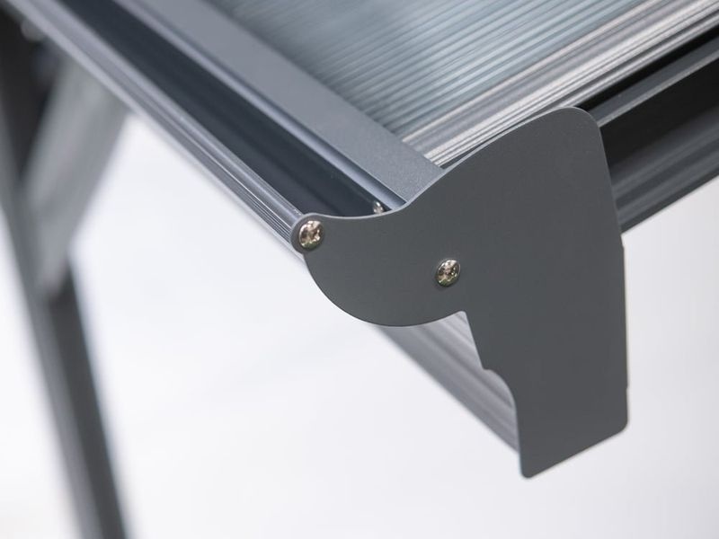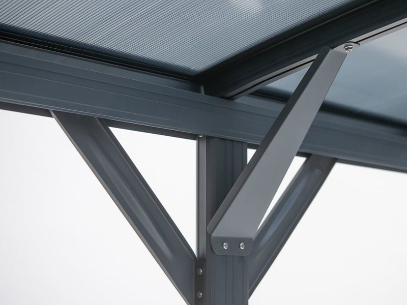 A tető 6 mm vastag cellás polikarbonát lemezekből készült, amelyek UV-állók és elegendő fényt engednek át. A csomag tartalmazza az integrált ereszcsatorna rendszert is, amely hatékonyan vezeti el az esővizet.