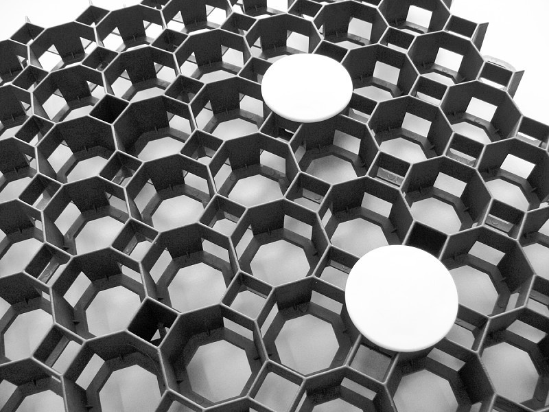 A fehér műanyag jelölő alkalmas parkolóhelyek alakítására a Geopave PROFI műanyag gyeprácson. A gyepráccsal fedett felület így füvesített autóparkolóként hasznosítható.