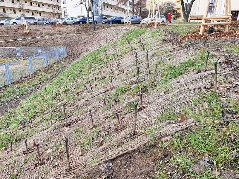 Még jobb választás a Geomat K-P kókusz erózióvédelmi matrac. A fű mindkét említett terméken képes átnőni. Egy ilyen meredek lejtőn már locsolni kell a gyepet, az utóbbi években tapasztalható heves záporok már nem jelentenek igazi megoldást.Ha abban gondolkodik, hogy talajtakaró növényeket és bokrokat (pl. madárbirset) ültetne a lejtőre: