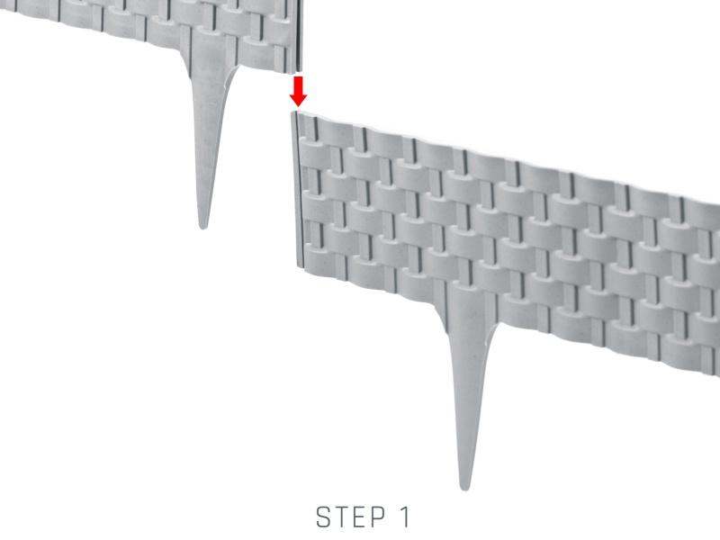 2. A következő elem rögzítéséhez használja a pázsitszegély oldalán lévő gyárilag kialakított kapcsolódási pontokat. Csak pattintsa össze az elemeket, így tetszőleges hosszúságú ágyásszegélyt alkothat.