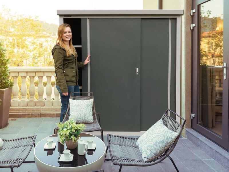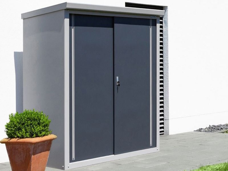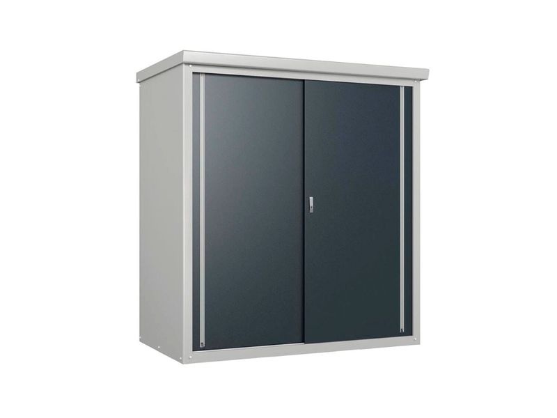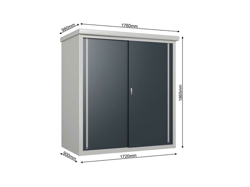 A Guardian D63 fém kerti szekrény a Trimetals márkától praktikus megoldást kínál mindenkinek, aki rendet szeretne tartani a kertben. Kompakt méreteinek köszönhetően kisebb helyekre is ideális, mégis elegendő tárolóhelyet biztosít szerszámok, kerti gépek vagy medencekellékek számára.