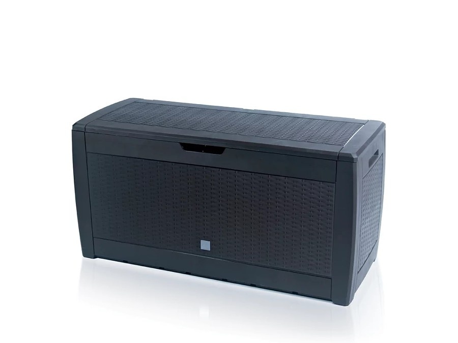A kerti tárolóláda műanyagból készül, amely ellenálló a szokásos időjárási hatásokkal szemben. A szerkezetnek része egy beépített lakatpánt is – a műanyag doboz így egyszerűen lezárható, ezzel megvédve a benne tárolt dolgokat.