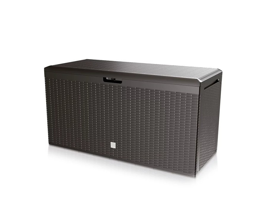 A kerti tárolóláda műanyagból készül, amely ellenálló a szokásos időjárási hatásokkal szemben. A szerkezetnek része egy beépített lakatpánt is – a műanyag doboz így egyszerűen lezárható, ezzel megvédve a benne tárolt dolgokat.