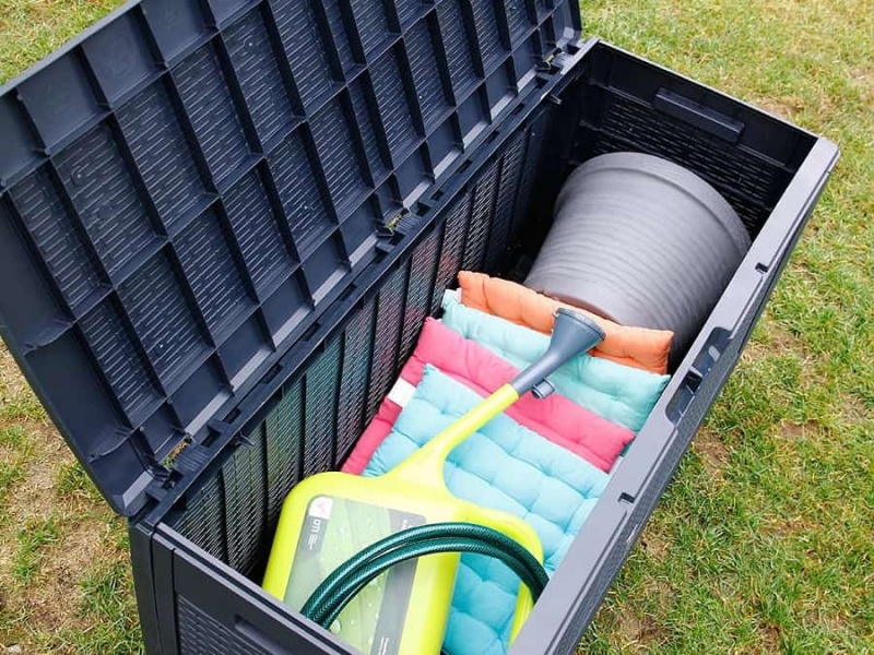 290 vagy 310 literes kapacitású műanyag tárolódoboz. Megbízható megoldás székpárnák, kerti eszközök, párnák, takarók vagy játékok tárolására. A tárolódoboz kis kerekkel, oldalain fogantyúkkal is rendelkezik, ami megkönnyíti a mozgatását. Alapanyaga műanyag, amely megvédi a tárolt dolgokat a széltől és a napfénytől. A tárolóládát nem ajánlott közvetlen csapadék hatásának kitenni (nem vízálló).