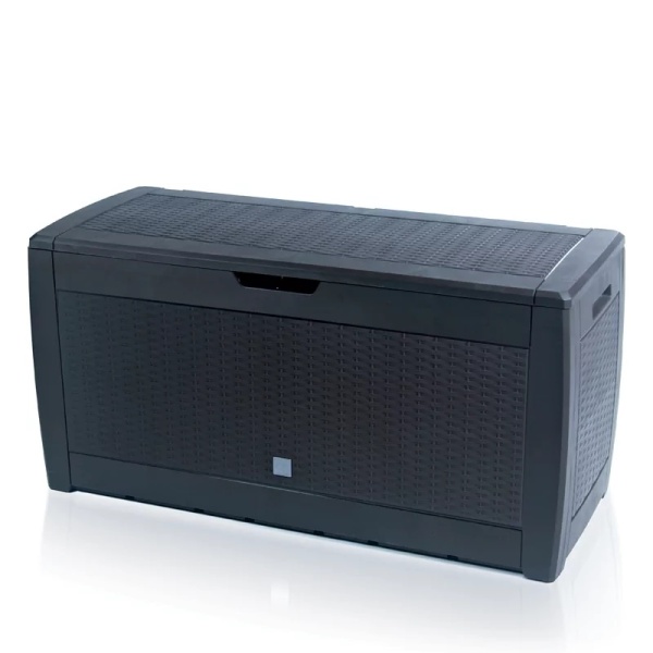 A kerti tárolóláda műanyagból készül, amely ellenálló a szokásos időjárási hatásokkal szemben. A szerkezetnek része egy beépített lakatpánt is – a műanyag doboz így egyszerűen lezárható, ezzel megvédve a benne tárolt dolgokat.