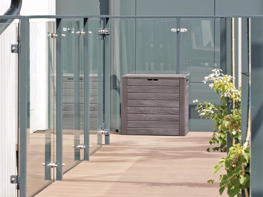 Ez a műanyag tárolódoboz egyszerre hasznos és szép kiegészítője a kertnek. A tárolóláda fahatású felülete illeszkedik a kerthez, és így nem zavarja meg a kültéren tapasztalható esztétikai élményt. Az oldalpanelek borításának textúráját rattanszövet és természetes bambusz ihlette. A láda gyakorlatilag nem igényel karbantartást, és nem szükséges a felületét kezelni.