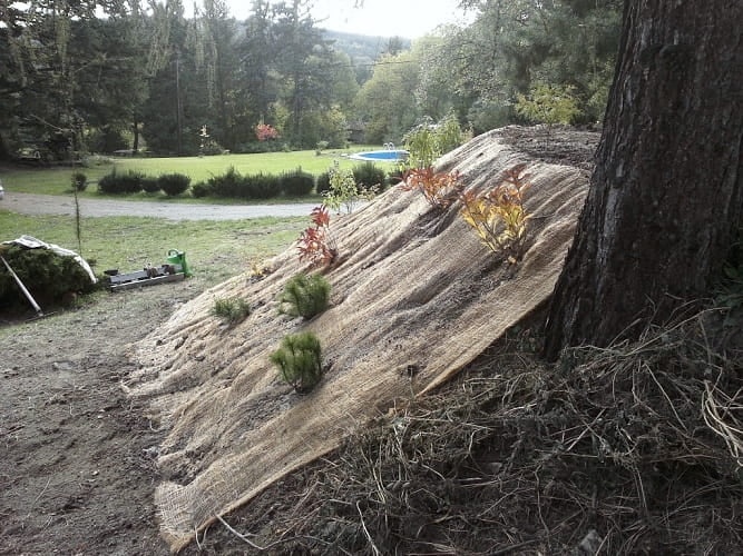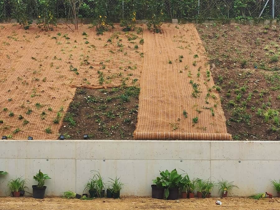 2. Növények elültetése: A nagyobb növényeket, bokrokat és fákat a kókusz erózióvédelmi matrac fektetése előtt is elültethetjük. A kisebb növények ültetése a lefektetett matracon keresztül is elvégezhető: csak vágjuk át a matracot egy éles tárgy segítségével, és a nyílásokon húzzuk át az elültetett növényeket.