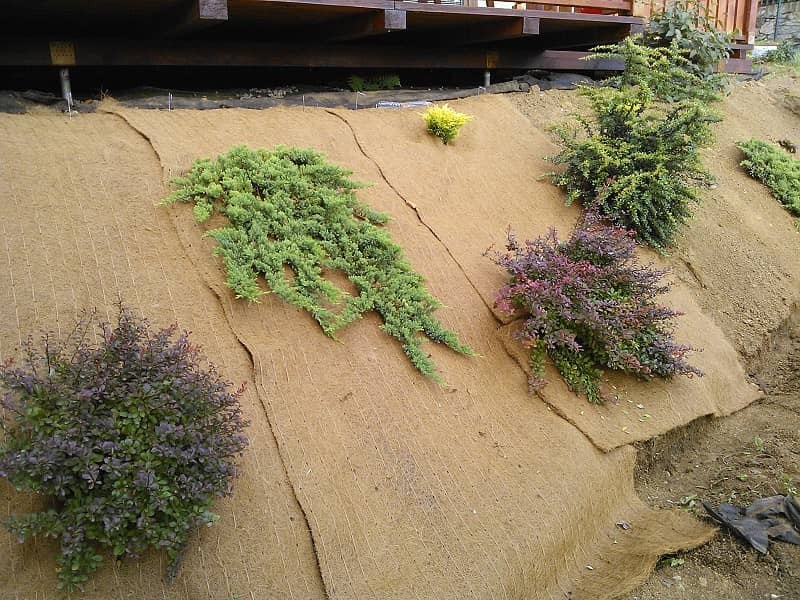 A nagyobb növényeket, bokrokat és fákat a kókusz erózióvédelmi matrac fektetése előtt ültessük el.