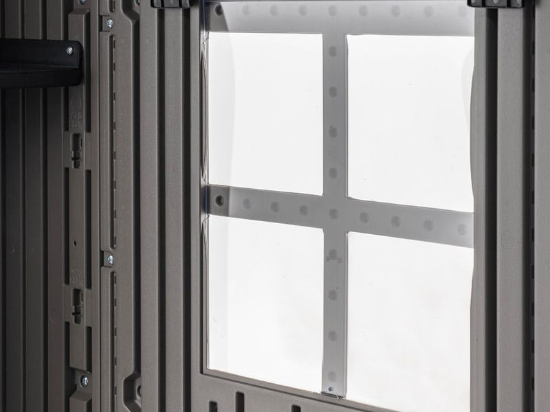 A ház nagy kétszárnyú ajtókkal rendelkezik, amelyek könnyű hozzáférést biztosítanak akár szélesebb felszerelésekhez is.