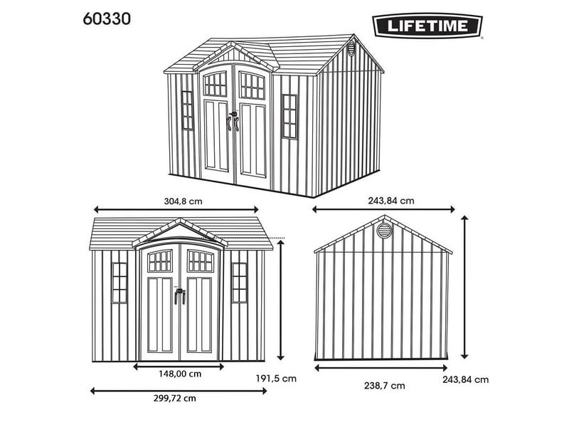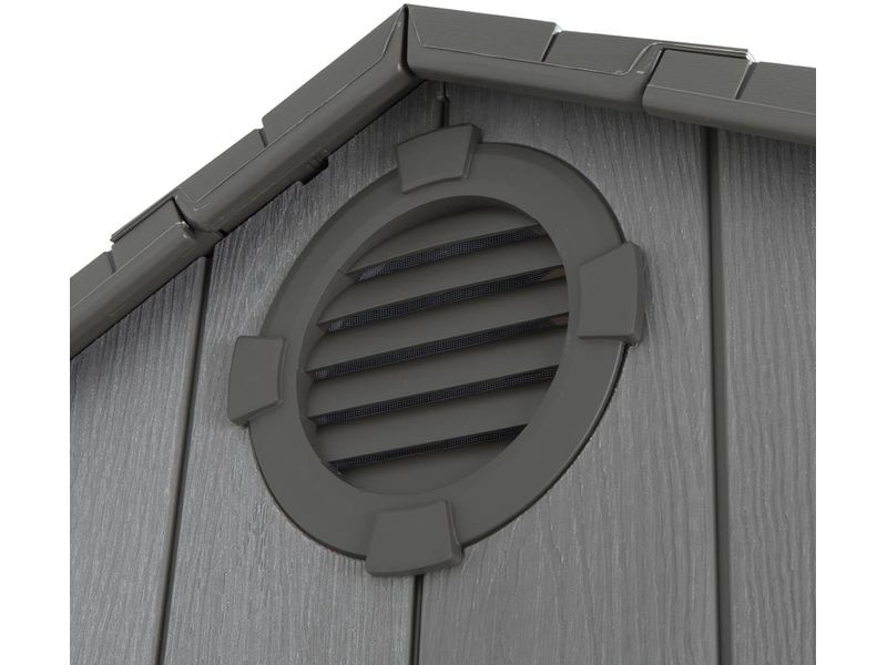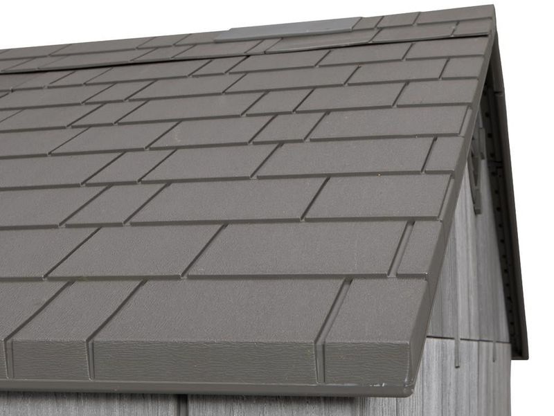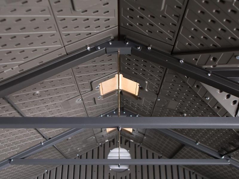A dupla falú, fémmel megerősített HDPE (nagy sűrűségű polietilén) konstrukció kivételes stabilitást nyújt. A tetőváz acélból készült, és akár 112 kg/m² hóterhelést is elbír, az optimális tetődőlés pedig gyors víz- és hóelvezetést tesz lehetővé.
