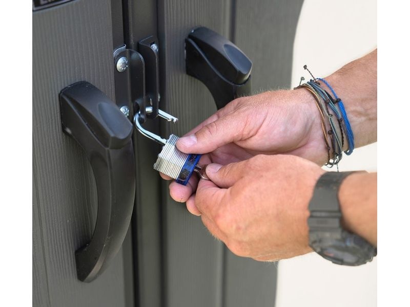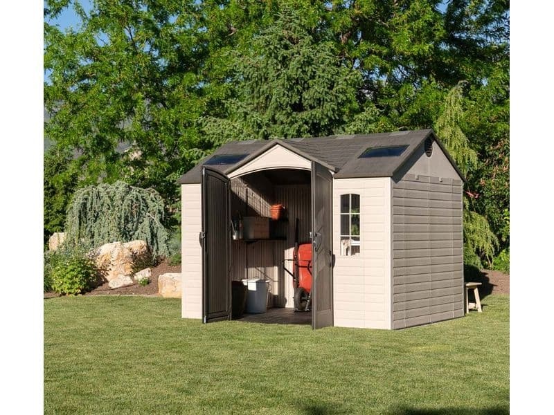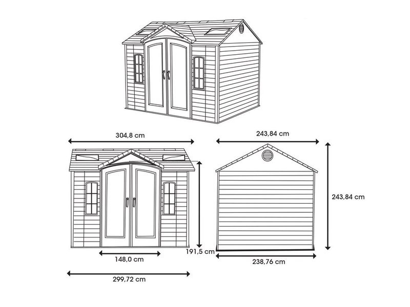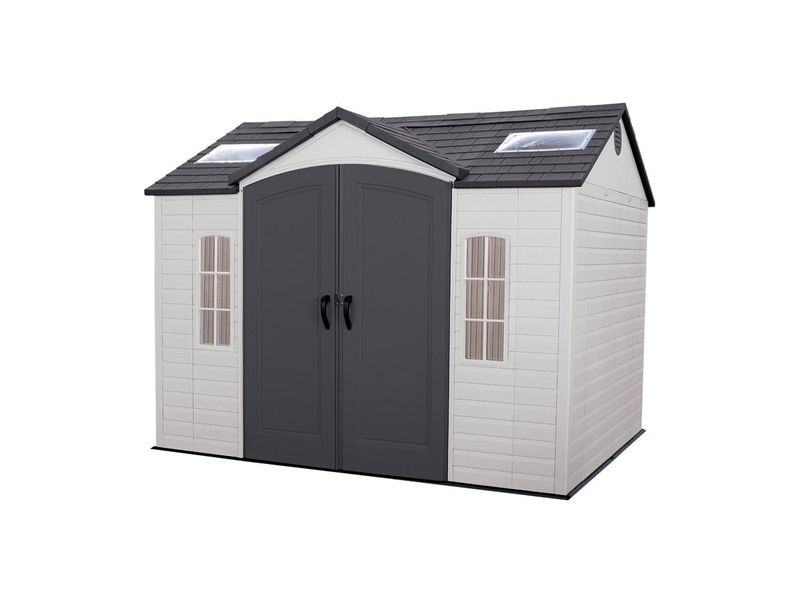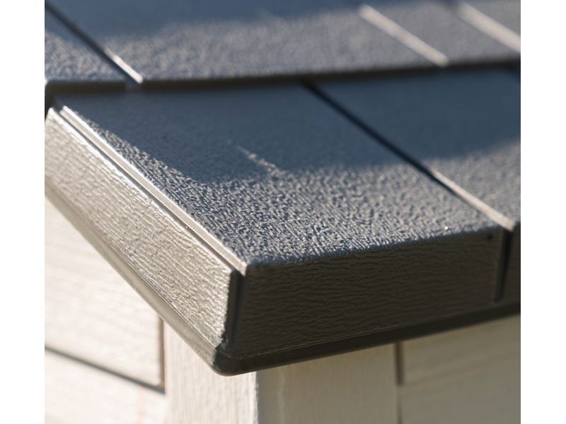 A tető dőlésszöge ennél a modellnél 30 fok, ami jelentősen csökkenti a hó mennyiségét és nyomását a tetőszerkezeten. A kerti ház továbbá zsanéros, kétszárnyú ajtókkal van felszerelve, amelyek nagyobb kényelmet biztosítanak a szerszámok és egyéb felszerelések tárolásakor.