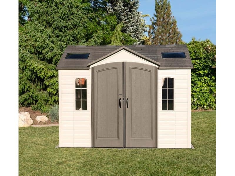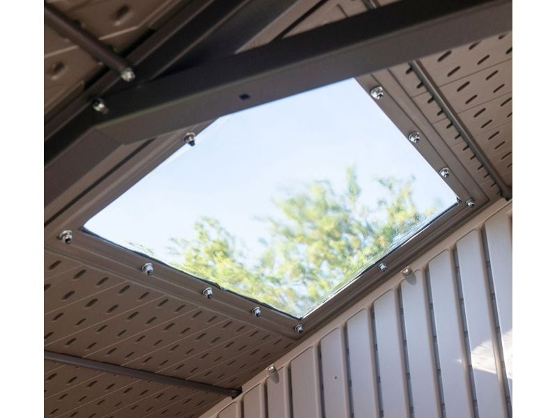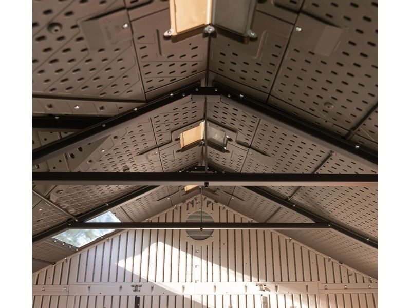 A kerti ház fém vázzal és dupla falú szerkezettel van ellátva: a tető, a kétszárnyú ajtók és a padló tartós és szinte törhetetlen műanyagból készültek. A csúszásmentes padló a szállítási csomag részét képezi.