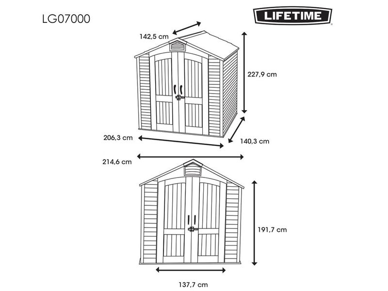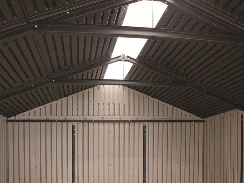 A dupla falú, fémmel megerősített HDPE (nagy sűrűségű polietilén) konstrukció kivételes stabilitást nyújt. A tetőváz acélból készült, és akár 195 kg/m² hóterhelést is elbír, az optimális tetődőlés pedig gyors víz- és hóelvezetést tesz lehetővé.