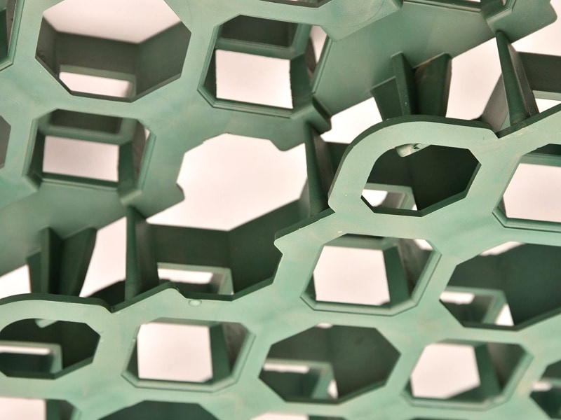 A műanyag gyeprács ellenálló polietilénből és polipropilénből készül, nem tartalmaz nehézfémeket. Ez az anyag ellenálló az UV-sugárzással, az esővel, az útszóró sóval, a gázolajjal és benzinnel szemben, ráadásul teljesen újrahasznosítható. Nem bocsát ki káros anyagokat a környező talajba.