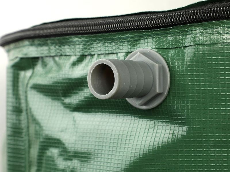 A hordó erős PVC-ből készült, és 8 darab (Ø 20 mm) PVC rúd alkotta stabil vázzal rendelkezik. A fedél cipzárral és beépített védőhálóval van ellátva, amely megakadályozza a szennyeződések bejutását. A két praktikus leeresztőszelep lehetővé teszi a tömlő csatlakoztatását vagy a locsolókanna kényelmes feltöltését. A hordó túlfolyóval is fel van szerelve, amely megakadályozza a túlcsordulást. Az egyszerű szerelési rendszernek köszönhetően az összeszerelés gyors és speciális szerszámokat nem igényel.