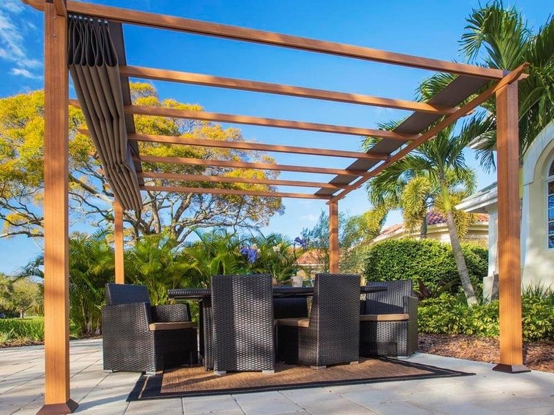 A pergola nem merev hardtop tetővel rendelkezik, hanem légies lamellás kialakítással. A rugalmas árnyékolást 0,8 mm vastag poliészter napvitorla biztosítja, amely akár 70%-os UV-védelmet nyújt. Az anyag vízlepergető és könnyen tisztítható puha ronggyal és szappanos vízzel.