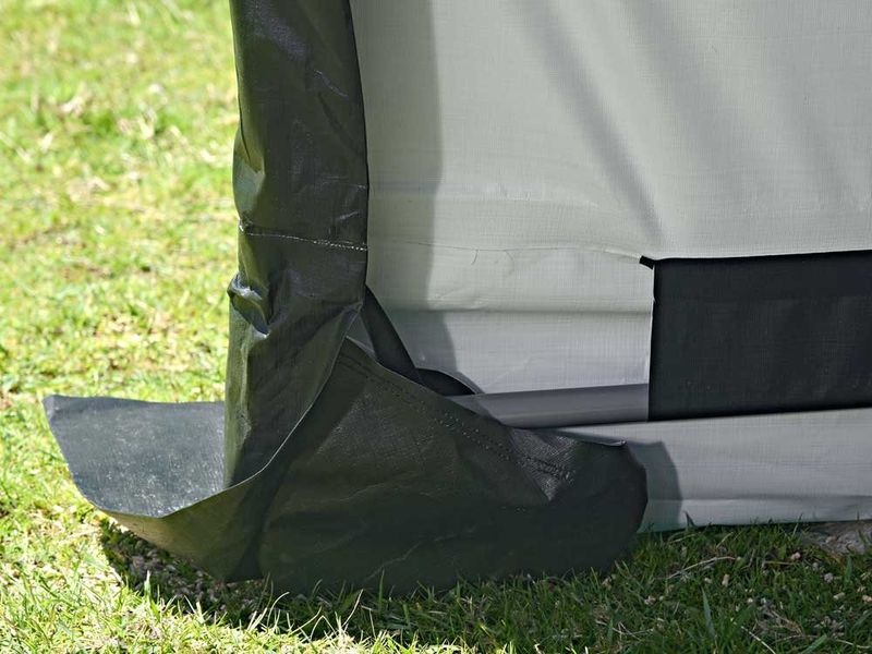 A ponyva rögzítése racsnis feszítőhevederrel történik. A csomagban 4 földhorgony található, amelyek a ponyvát rögzítik, így biztosítva van a szél és az időjárás viszontagságai ellen. A nyílás magassága 140 cm.