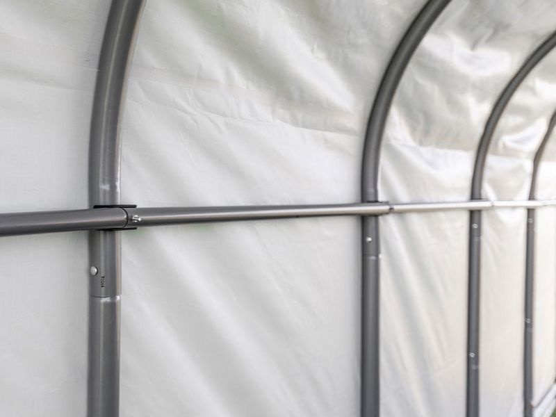 A ponyvagarázs szerkezete 60 mm átmérőjű acélcsövekből készült, ami biztosítja a szilárdságot és a tartósságot. A csövek prémium minőségű korrózióvédő bevonattal vannak ellátva. Annak érdekében, hogy az állatai védve legyenek a sérülésektől, a váz lábai védőburkolatokkal vannak ellátva. A keresztmerevítők 308 cm magasan vannak, és 281 cm szélesek.