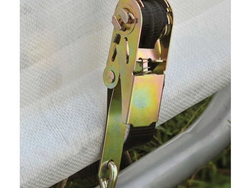 A ponyva rögzítése feszítőracsnikkal történik, és a bejárat nyílás (szélesség: 147 × magasság: 137 cm) két cipzárral és gumis rögzítőkkel van ellátva a könnyű nyitás/zárás érdekében. A csomag tartalmaz egy teljes rögzítőkészletet, ami négy darab 38 cm-es rögzítő cöveket foglal magában. A 8 darab rögzítő heveder a kerethez való stabil rögzítésre szolgál, és védelmet nyújt a szél és az időjárás viszontagságaival szemben.