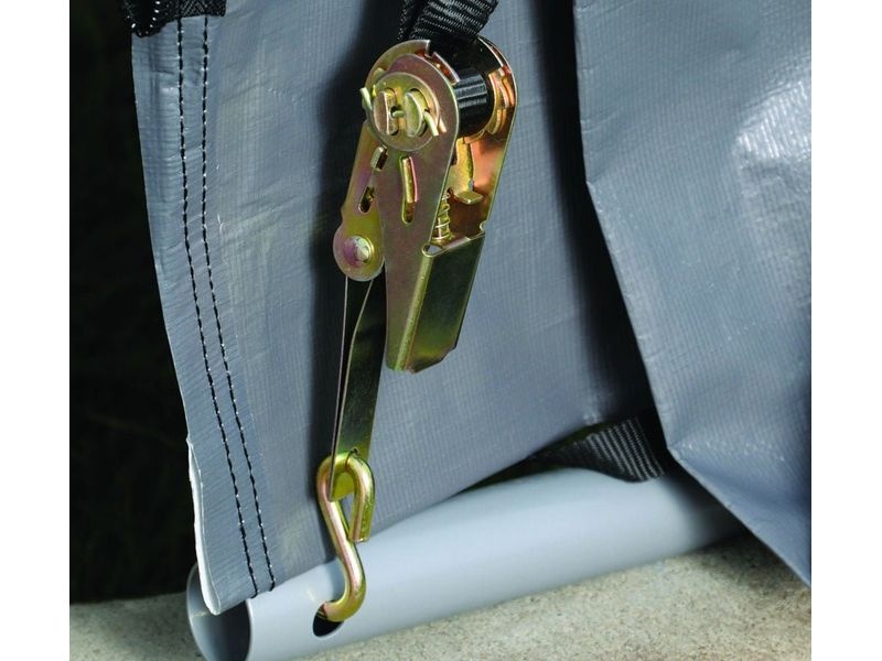 A ponyva rögzítése feszítőracsnikkal történik, és a bejárat nyílás (szélesség: 200, 160 × magasság: 180 cm) két cipzárral és gumis rögzítőkkel van ellátva a könnyű nyitás/zárás érdekében. A csomag tartalmaz egy teljes rögzítőkészletet, ami négy darab 38 cm-es rögzítő cöveket foglal magában. A 8 darab rögzítő heveder a kerethez való stabil rögzítésre szolgál, és védelmet nyújt a szél és az időjárás viszontagságaival szemben.