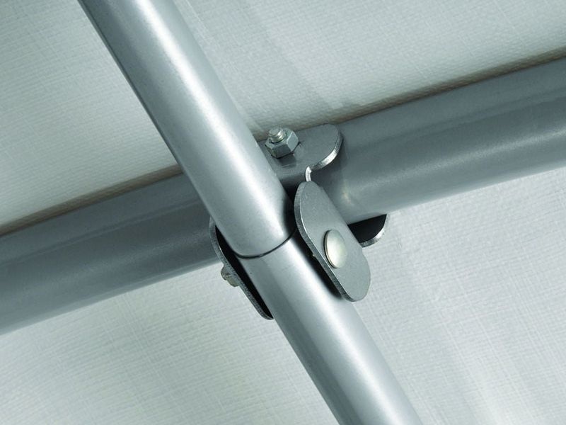 A ponyva rögzítése feszítőracsnikkal történik, és a bejárat nyílás (szélesség: 200, 160 × magasság: 180 cm) két cipzárral és gumis rögzítőkkel van ellátva a könnyű nyitás/zárás érdekében. A csomag tartalmaz egy teljes rögzítőkészletet, ami négy darab 38 cm-es rögzítő cöveket foglal magában. A 8 darab rögzítő heveder a kerethez való stabil rögzítésre szolgál, és védelmet nyújt a szél és az időjárás viszontagságaival szemben.