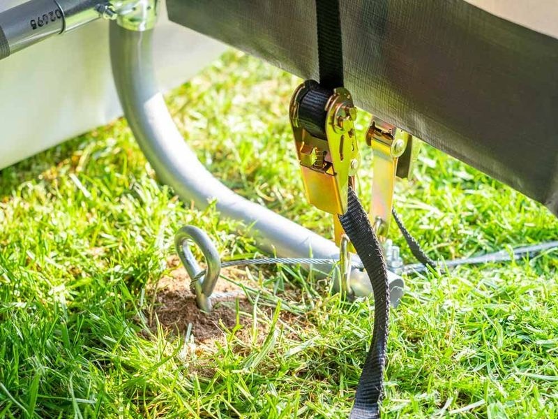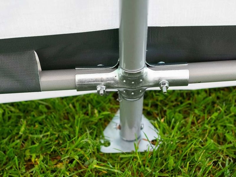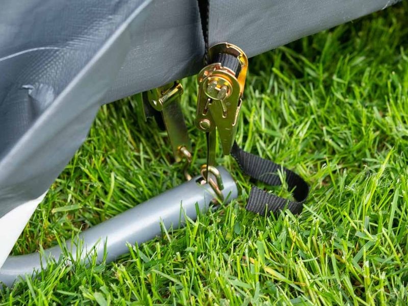 A ponyva rögzítése feszítőracsnikkal történik, és a bejárat nyílás (szélesség: 300 × magasság: 180 cm) két cipzárral és gumis rögzítőkkel van ellátva a könnyű nyitás/zárás érdekében. A csomag tartalmaz egy teljes rögzítőkészletet, ami négy darab 38 cm-es rögzítő cöveket foglal magában. A 8 darab rögzítő heveder a kerethez való stabil rögzítésre szolgál, és védelmet nyújt a szél és az időjárás viszontagságaival szemben.
