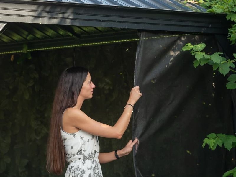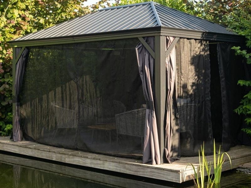 A pavilonhoz nylon szúnyoghálók tartoznak. Kiegészítőként poliészter függönyök is megvásárolhatók. A kettős sínrendszernek köszönhetően a szúnyoghálók és a függönyök egyidejűleg is rögzíthetők. Más modellektől eltérően itt nem „vagy-vagy” megoldásról van szó – a szúnyoghálót és a függönyt egyszerre is lehet használni.