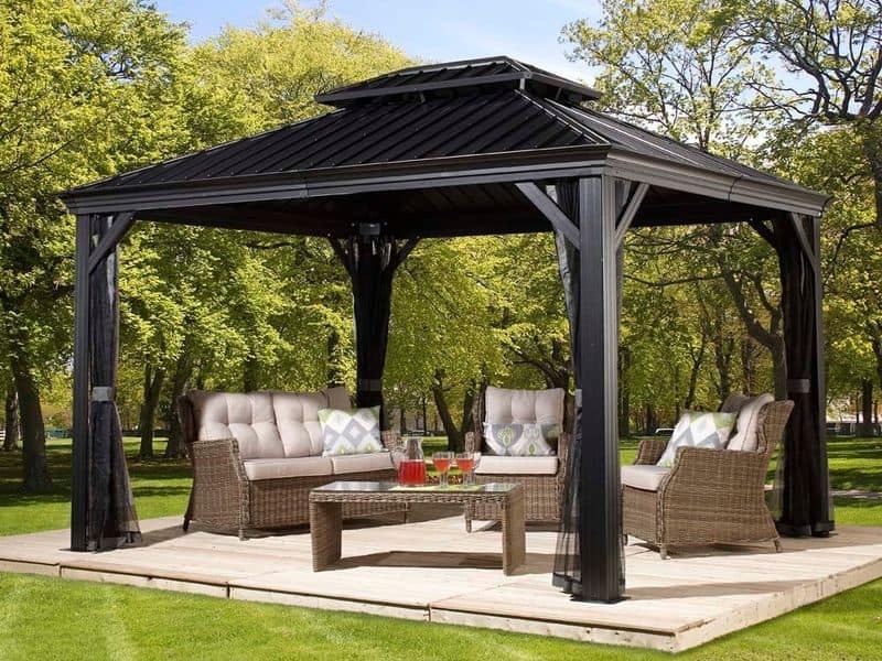 Az alumínium kerti pavilon kellemes és hangulatos pihenőhelyet biztosít a ház mellett vagy a kert bármely pontján. Szúnyoghálóval van ellátva, amely megvéd a szúnyogoktól a meleg nyári estéken.