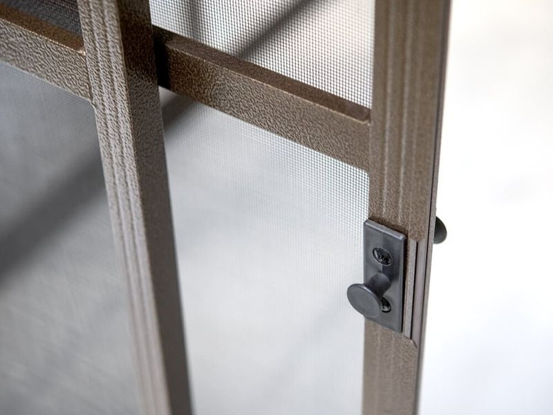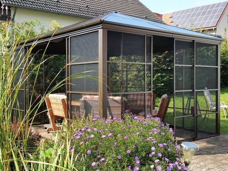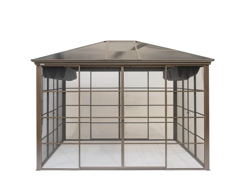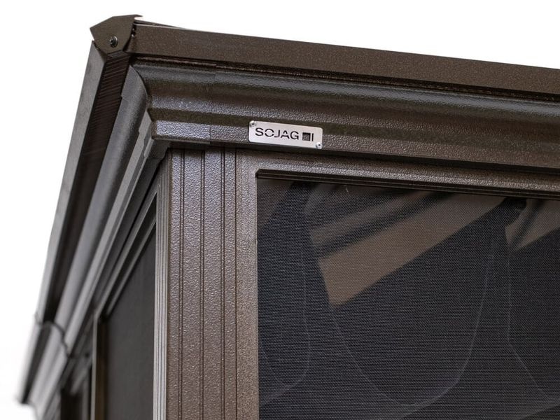A pavilon teljes kerülete alumíniummal megerősített szúnyoghálóval van ellátva. Mind a négy oldalon dupla tolóajtók találhatók (nyílásméretek: keskeny oldal 140×210 cm, széles oldal 205×210 cm). Így akkor is élvezheti a nyugalmat és a kilátást a kertre, amikor kint esik az eső.