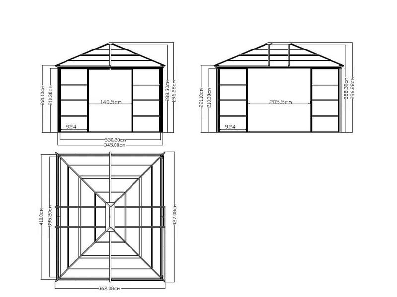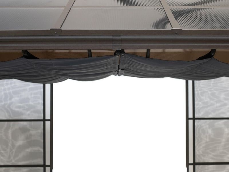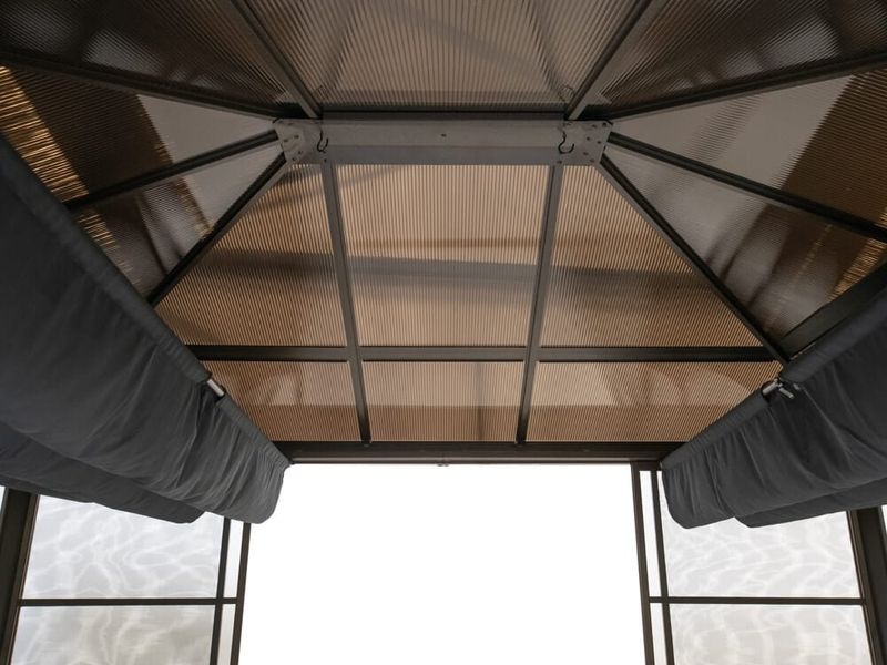 A tető 8 mm vastag, dupla lamellákból készült. Különösen nagy stabilitást biztosít, és könnyedén ellenáll az időjárási viszontagságoknak, mint például az eső, hó vagy napsütés. Ennek köszönhetően a kerti pavilon egész évben a helyén maradhat.