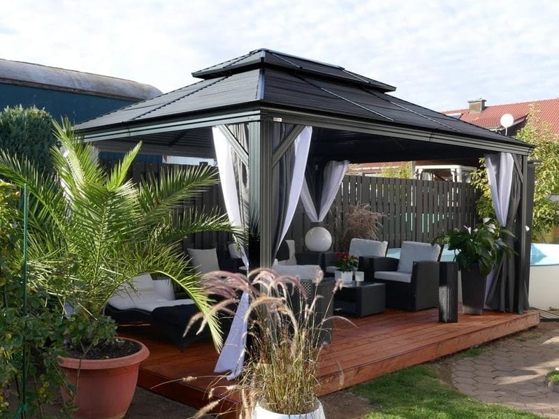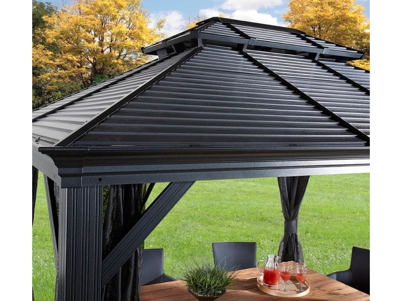 Az alumínium kerti pavilon kellemes és hangulatos pihenőhelyet biztosít a ház mellett vagy a kert bármely pontján. Szúnyoghálóval van ellátva, amely megvéd a szúnyogoktól a meleg nyári estéken.