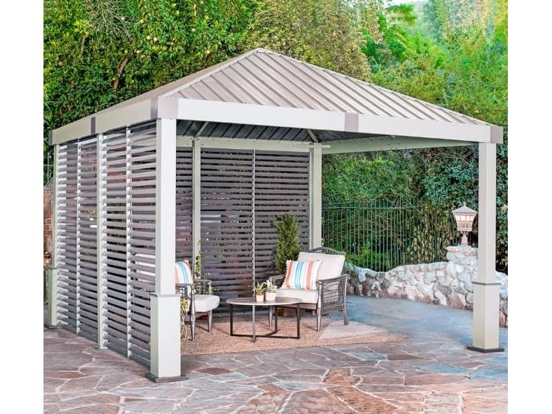 A pavilon szerkezete oldalfalakkal egészül ki, amelyek ferde lamellákból