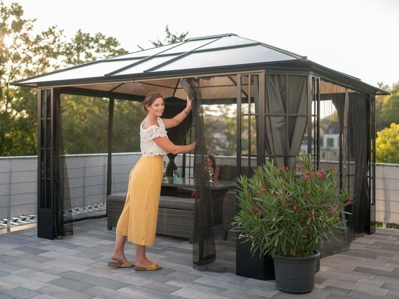 Az alumínium kerti pavilon kellemes és hangulatos pihenőhelyet biztosít a ház mellett vagy a kert bármely pontján. Szúnyoghálóval van ellátva, amely megvéd a szúnyogoktól a meleg nyári estéken.
