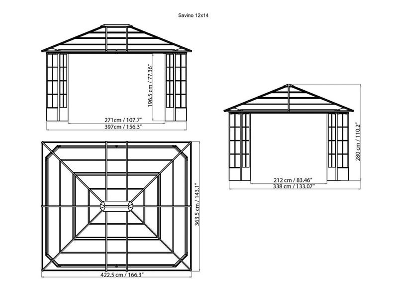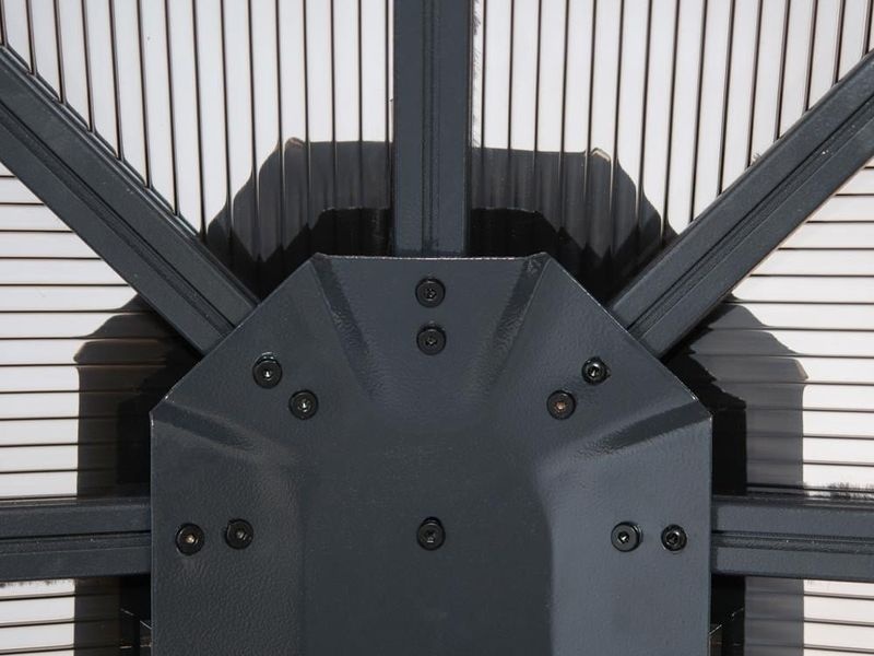A tető 8 mm vastag, dupla lamellákból készült. Különösen nagy stabilitást biztosít, és könnyedén ellenáll az időjárási viszontagságoknak, mint például az eső, hó vagy napsütés. Ennek köszönhetően a kerti pavilon egész évben a helyén maradhat.