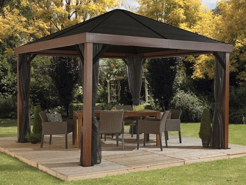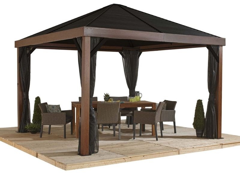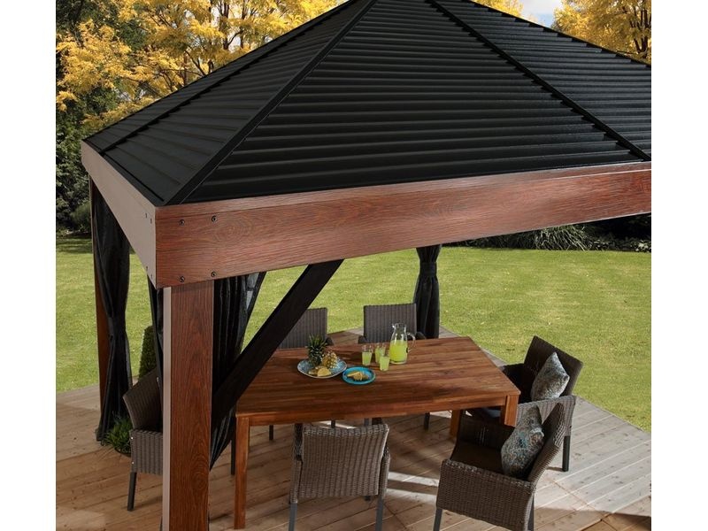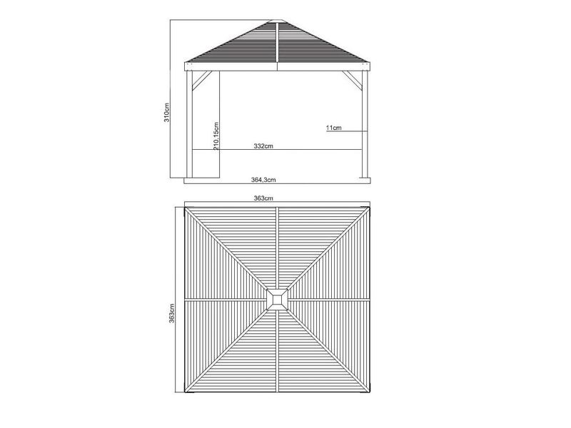 A tető tartós acélból készült, amely mindig szépen formázott. Különösen nagy stabilitást biztosít, és könnyedén ellenáll az időjárás viszontagságainak, például az esőnek, hónak vagy a nap (UV-sugárzás) hatásainak. Ennek köszönhetően a pavilon egész évben a helyén maradhat.