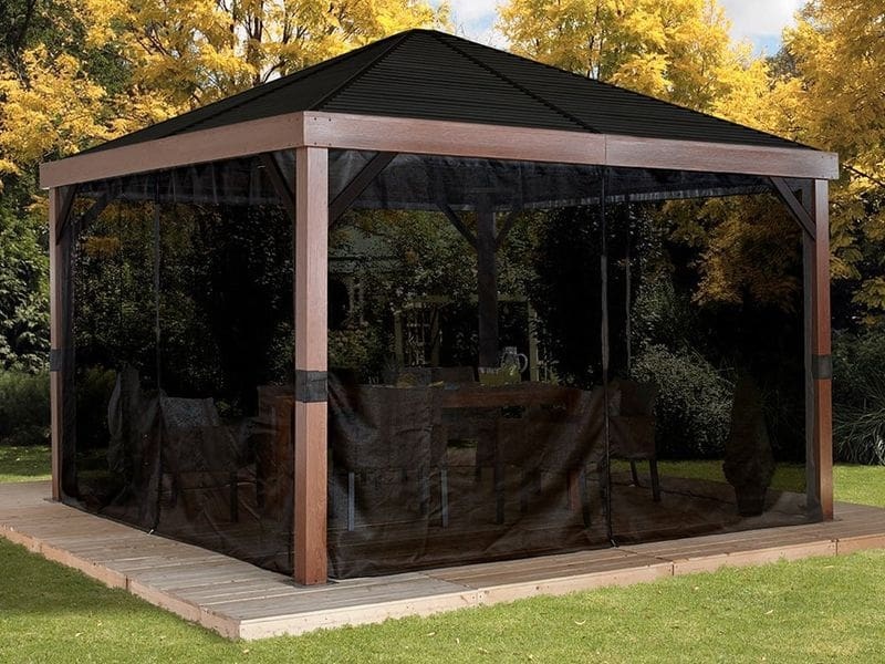 A pavilonhoz nylon szúnyoghálók tartoznak. Kiegészítőként poliészter függönyök is megvásárolhatók. A kettős sínrendszernek köszönhetően a szúnyoghálók és a függönyök egyidejűleg is rögzíthetők. Más modellektől eltérően itt nem „vagy-vagy” megoldásról van szó – a szúnyoghálót és a függönyt egyszerre is lehet használni.