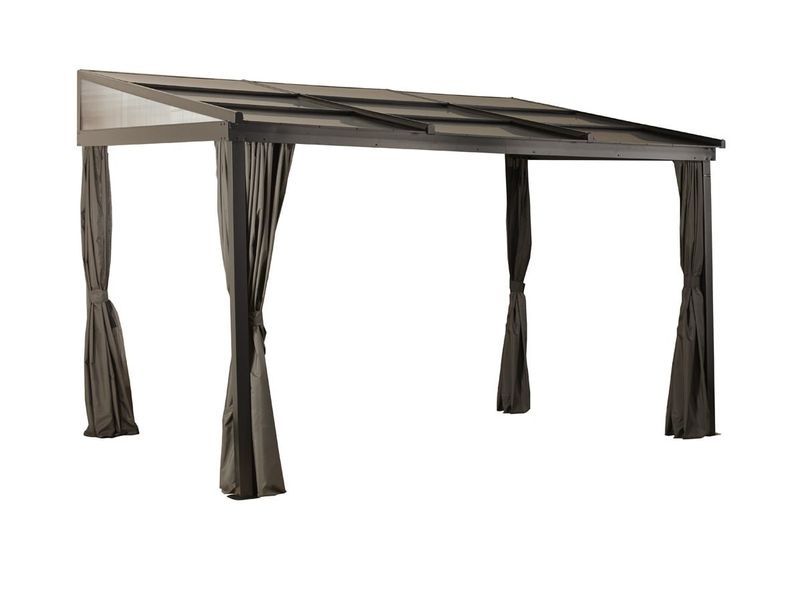 A falhoz rögzíthető alumínium pergola kellemes és meghitt pihenőhelyet biztosít közvetlenül az otthona mellett. Szúnyoghálóval és hosszú függönyökkel van ellátva, amelyek a forró nyári napokon árnyékot és magánszférát biztosítanak.