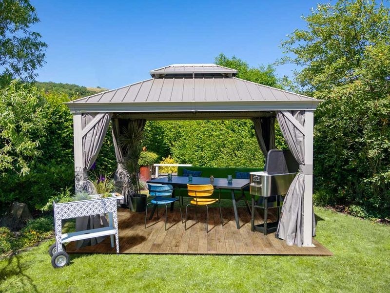 Messina 1012 kerti pavilonhoz való függönykészlet, amely nyáron árnyékot és magánszférát biztosít. Szín: taupe.