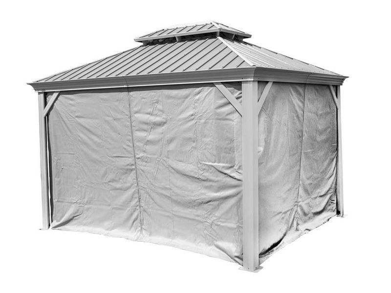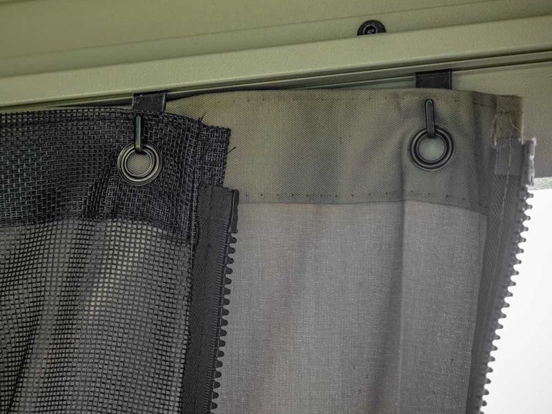 A függönyszett a teljes kerti pavilonhoz lett tervezve. Minden oldalt lefed, a függönyök pedig külön sínre vannak rögzítve, mint a rovarhálók, a dupla sínrendszernek köszönhetően. Ez megkönnyíti a kezelést.