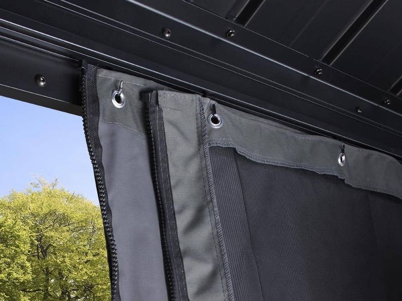 A függönyszett a teljes kerti pavilonhoz lett tervezve. Minden oldalt lefed, a függönyök pedig külön sínre vannak rögzítve, mint a rovarhálók, a dupla sínrendszernek köszönhetően. Ez megkönnyíti a kezelést.