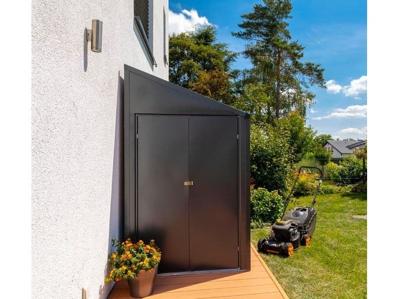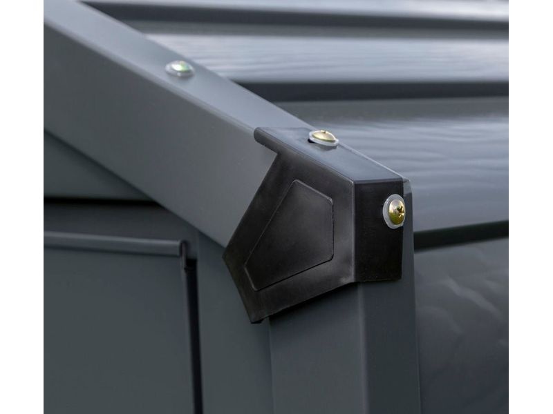 A fém kerti ház egyesíti a rendkívül masszív acéllemez szerkezet előnyeit az időtálló és modern színvilággal, amely diszkréten illeszkedik bármilyen környezetbe. A fa tárolókkal ellentétben ez a lemezből készült ház nem igényel rendszeres karbantartást vagy kezelést.