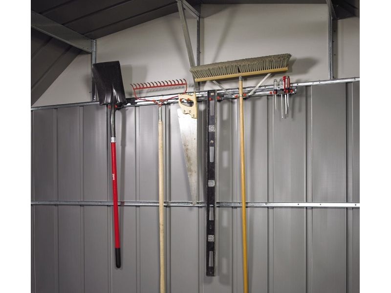 A mellékelt kampók segítségével könnyedén rendszerezhetők és tárolhatók a seprűk, lombgereblyék, lapátok, partvisok és még sok más szerszám.